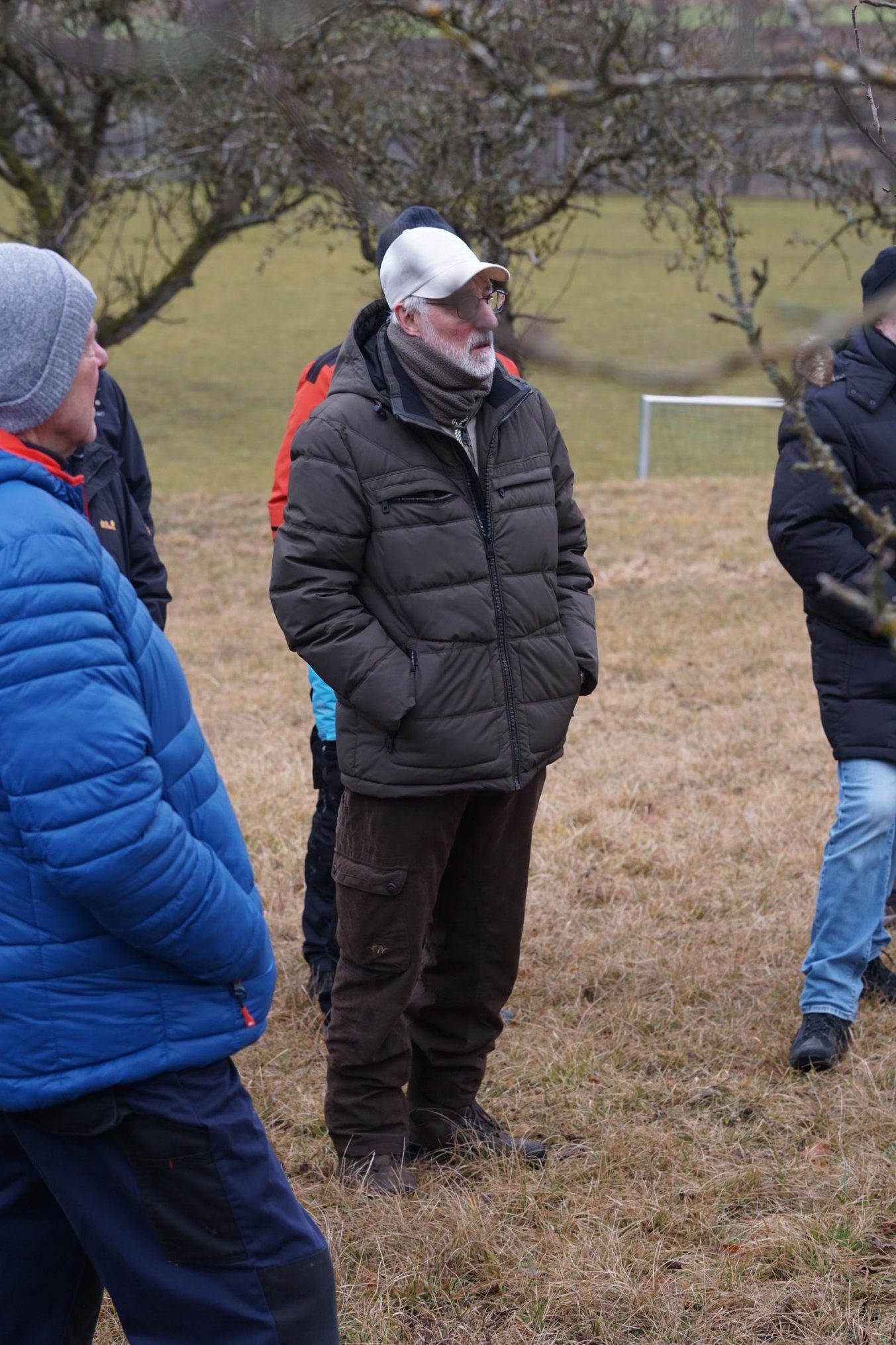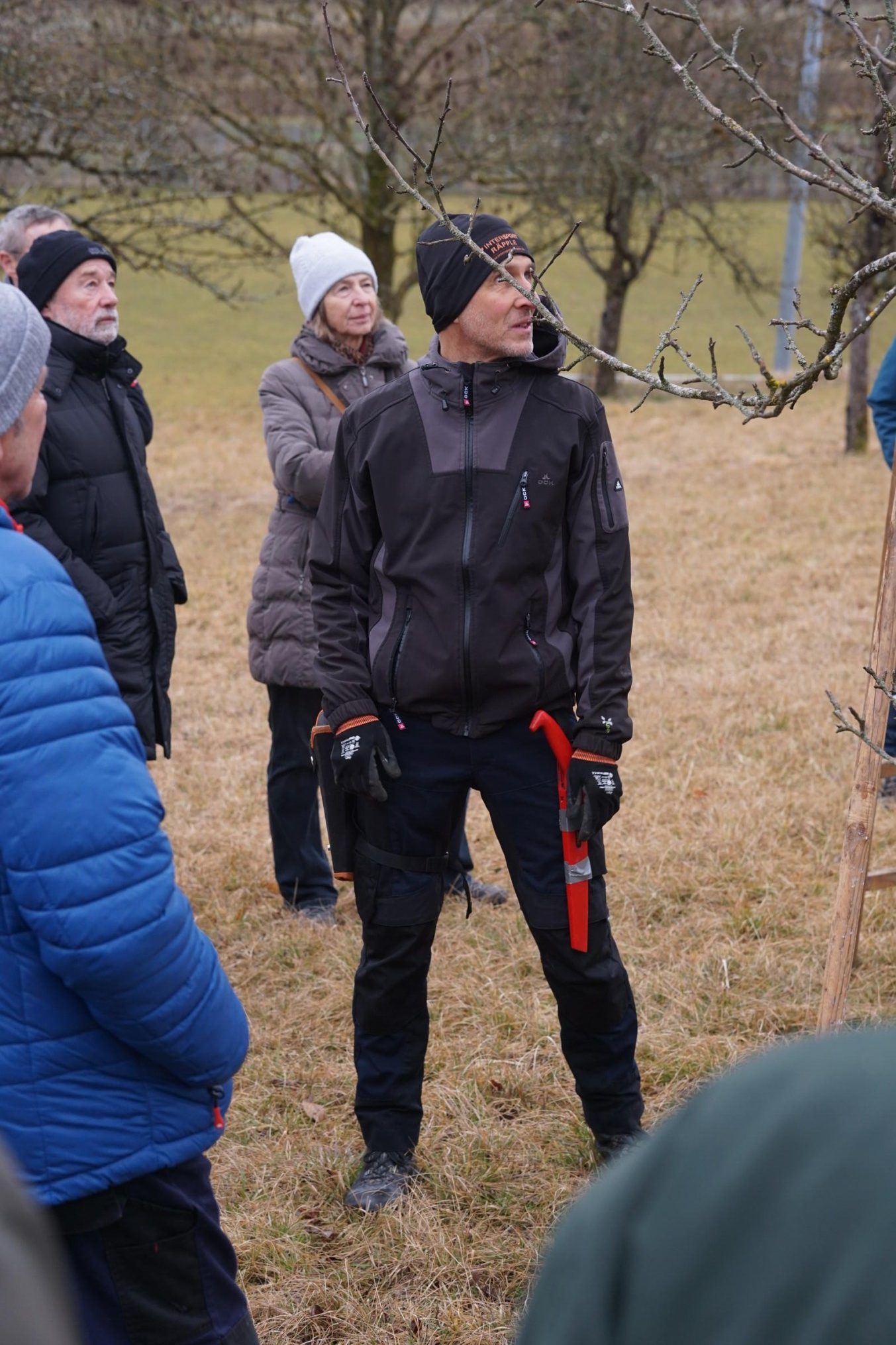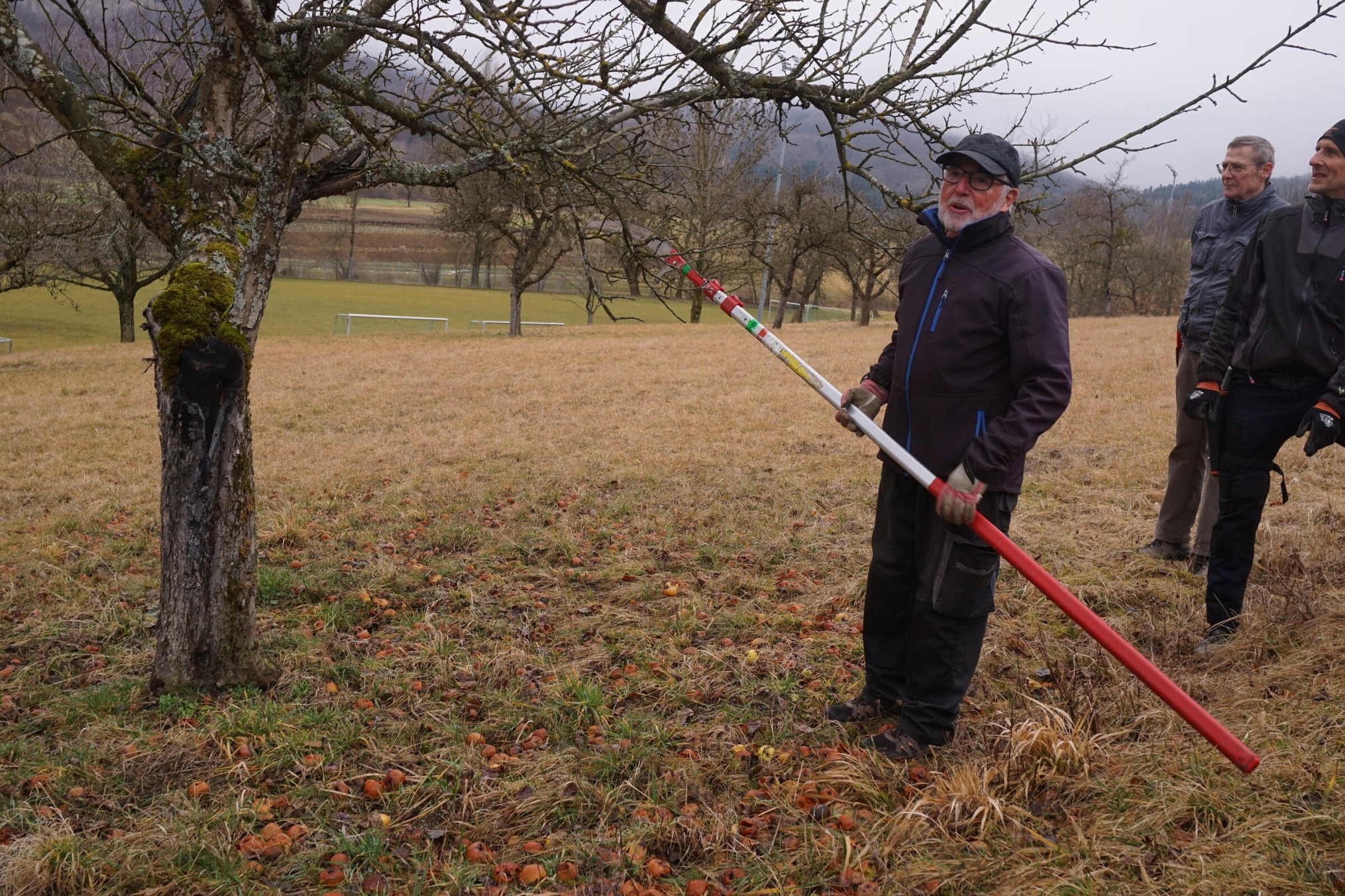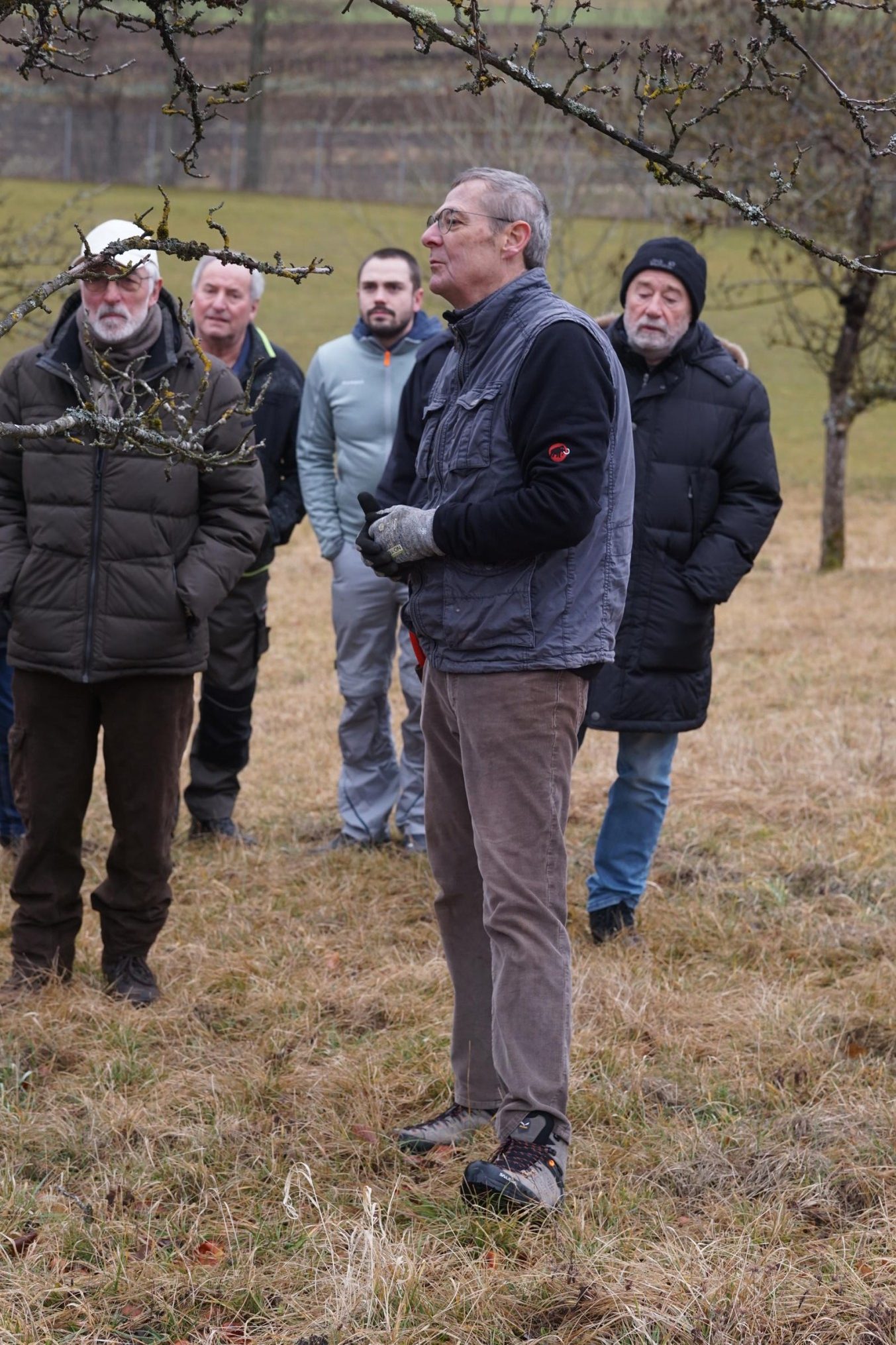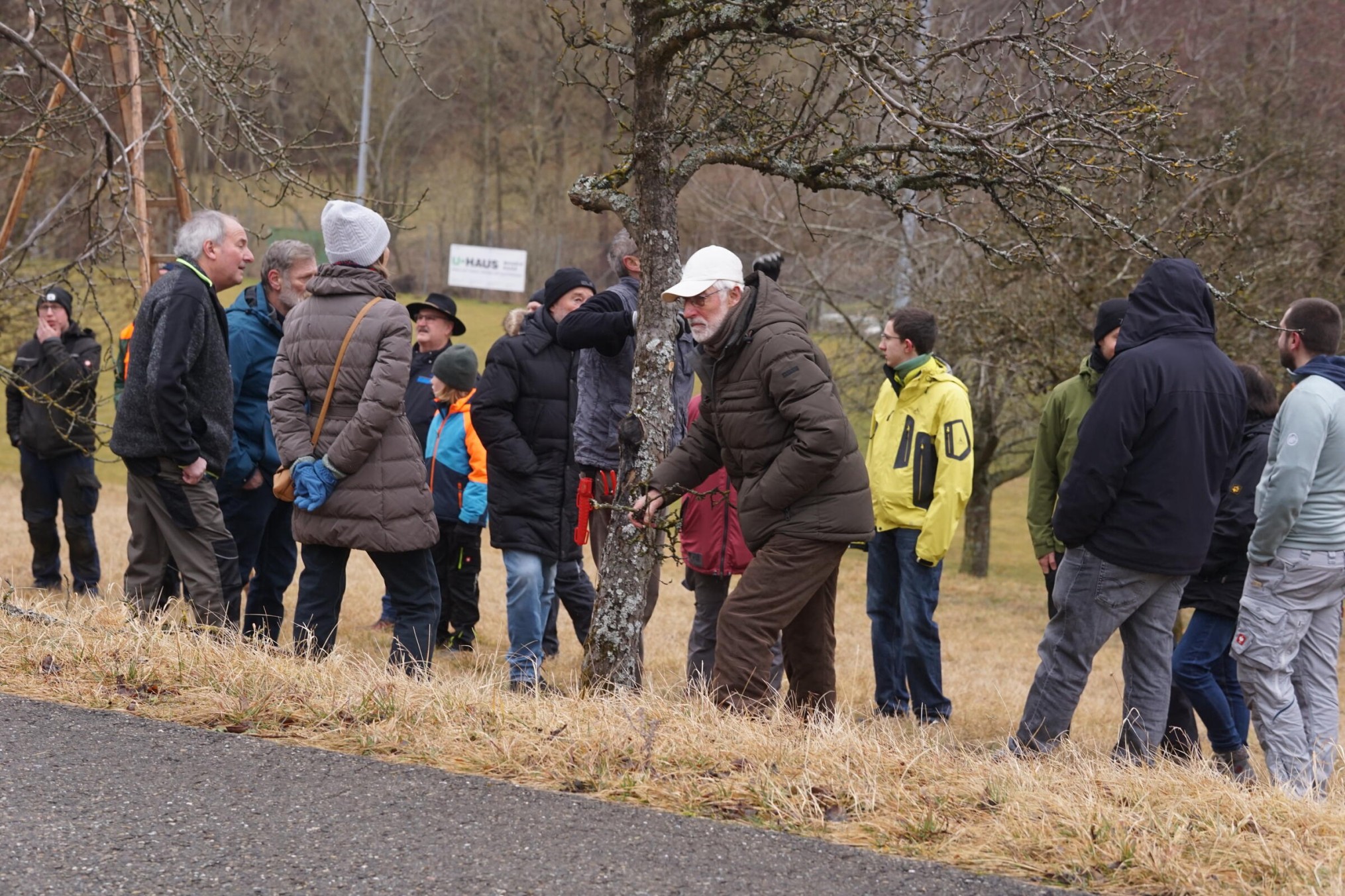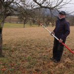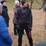 So um die 15 Teilnehmer hatten wir erwartet – gekommen waren 31. Erfreulich: es waren nicht nur Talheimer oder Albvereinler anwesend. Sammelpunkt war am Sportplatz Talheim, genauer gesagt: eine Baumgruppe neben dem Vereinsheim, die etwas pflegebedürftig war. Hans Wener, der 1. Vorsitzende des OGV Mössingen und drei weitere Vereinsmitglieder zeigten, wie man fachgerecht Obstgehölze schneidet und pflegt.