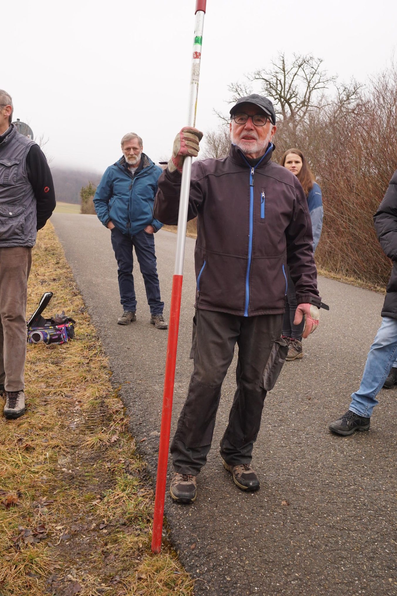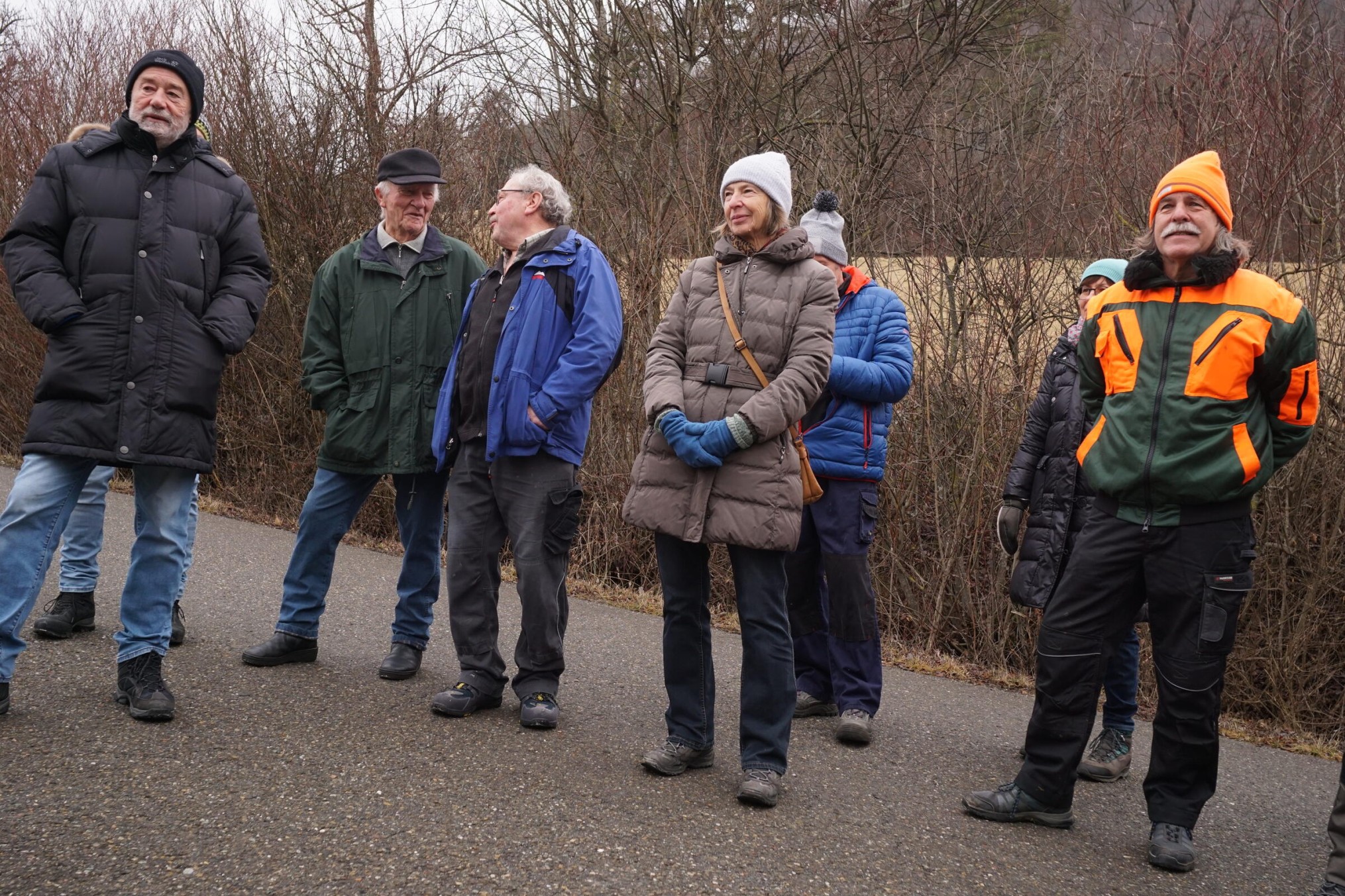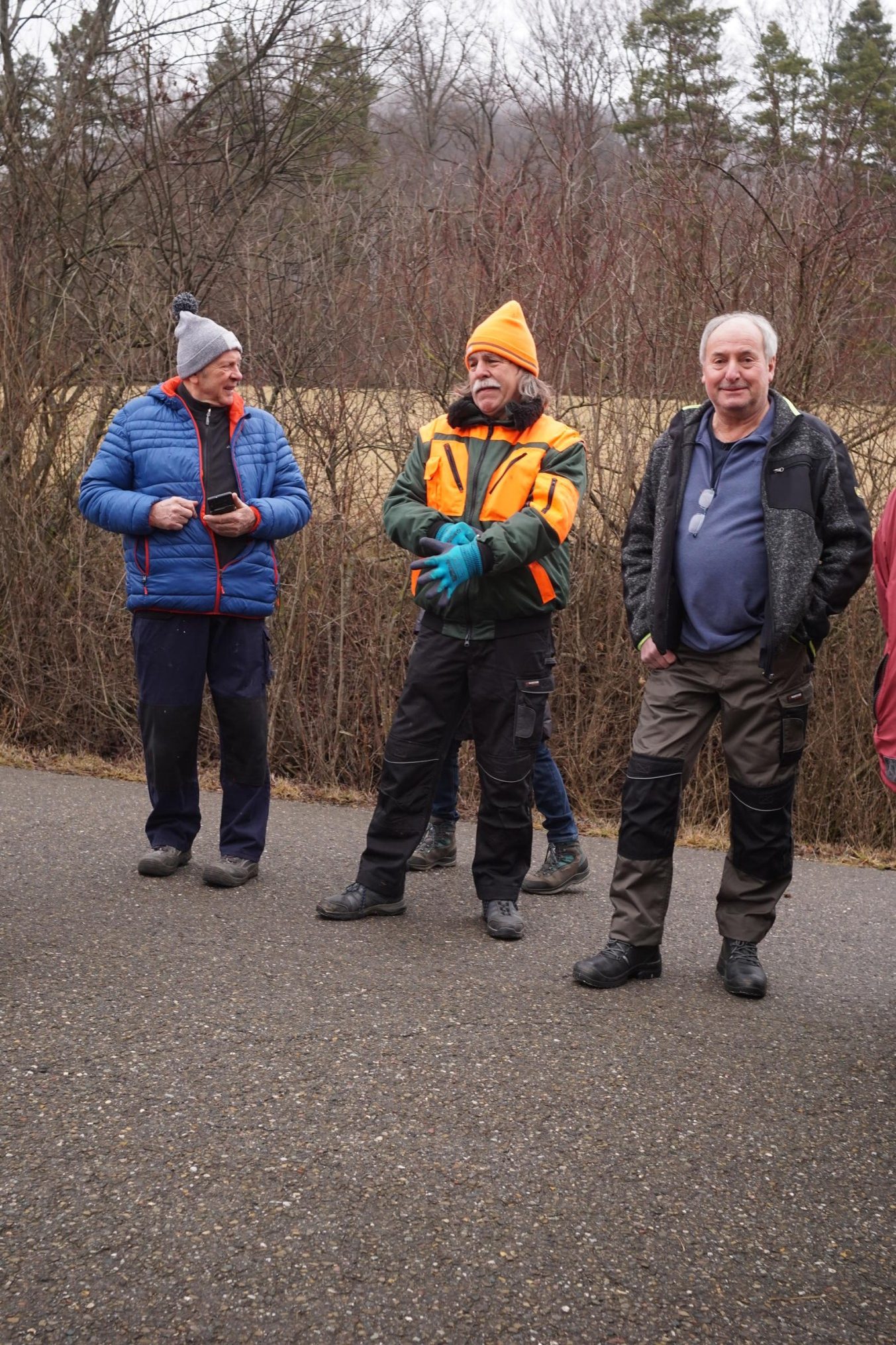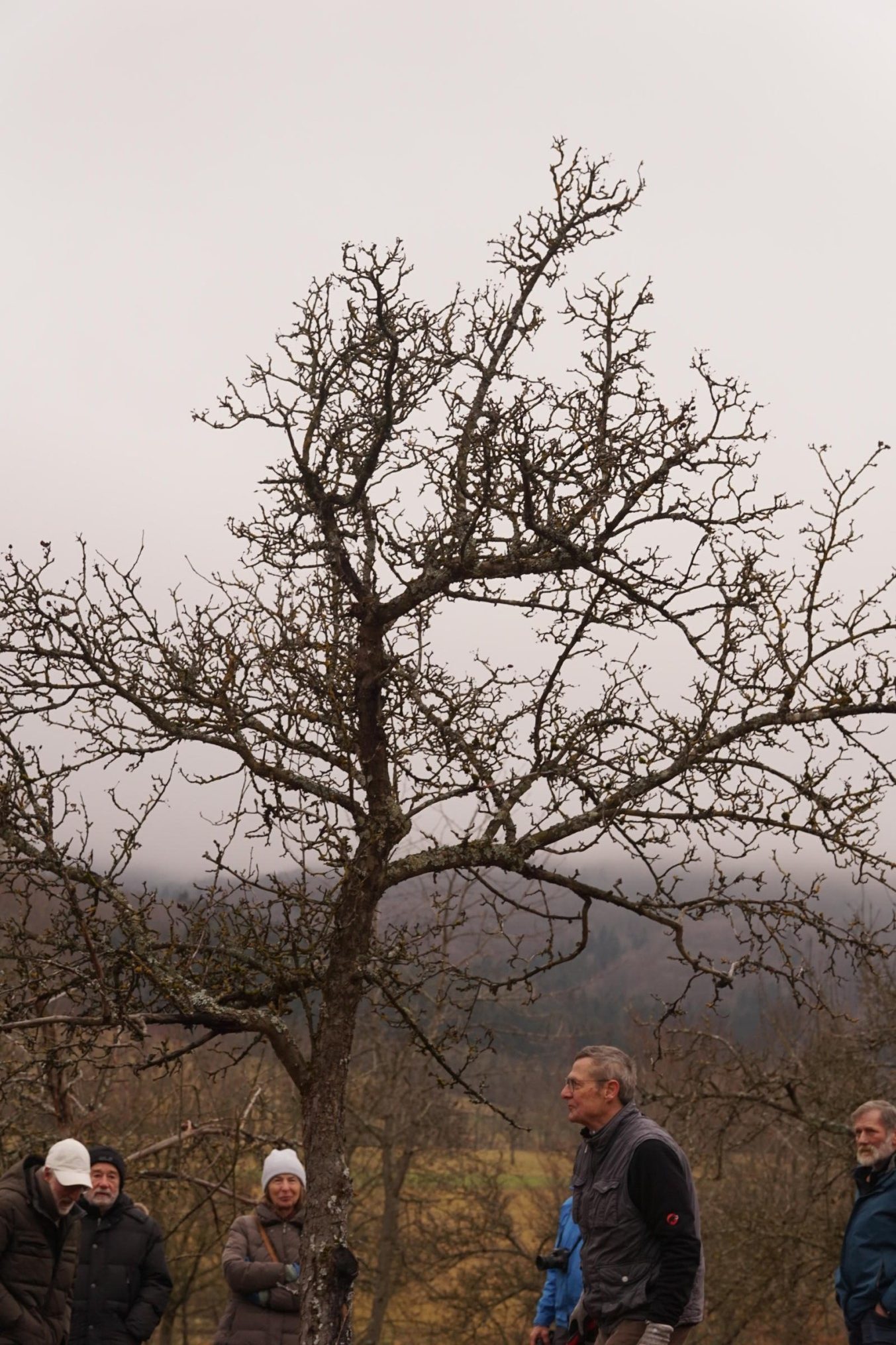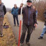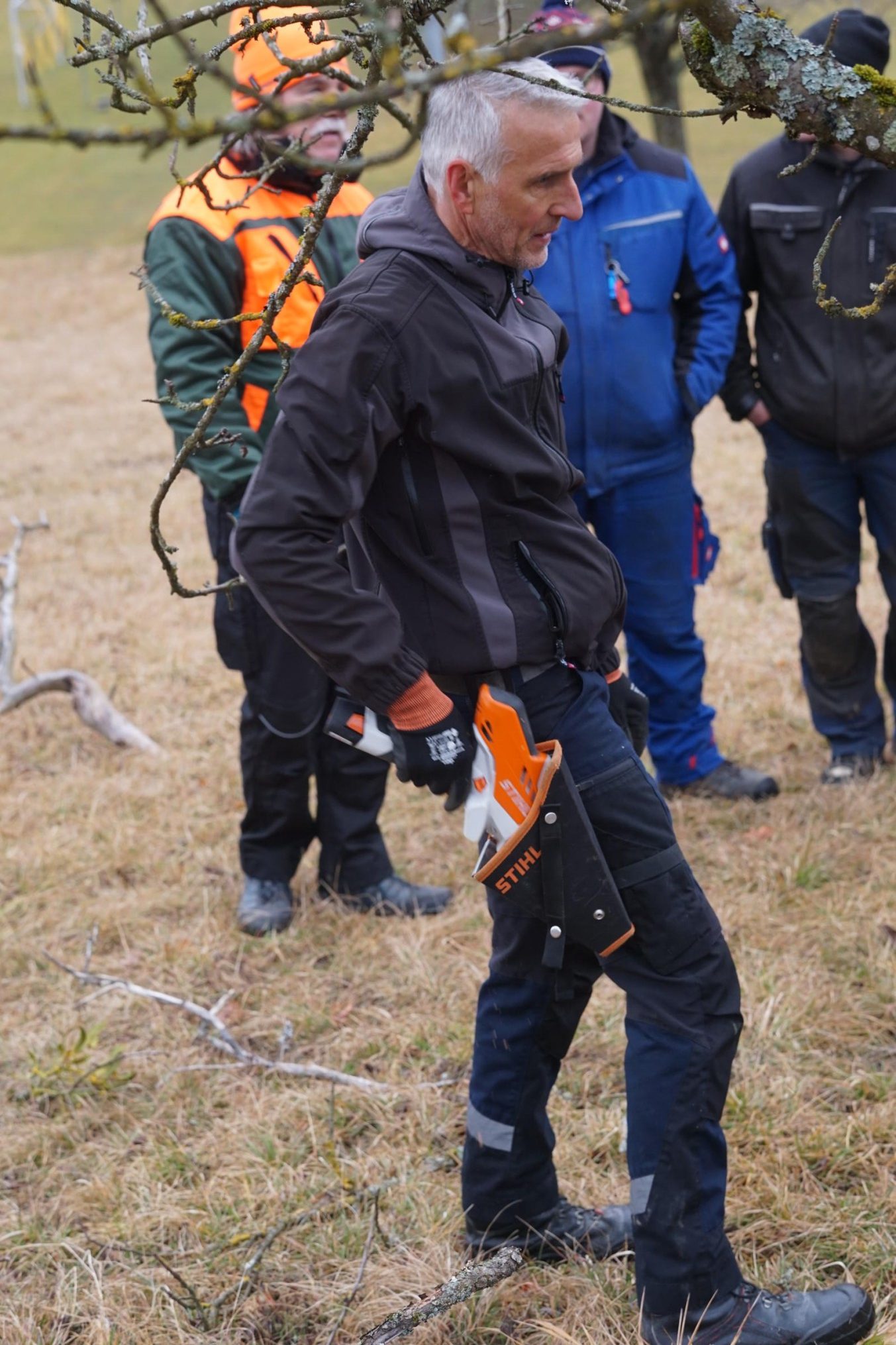So um die 15 Teilnehmer hatten wir erwartet – gekommen waren 31. Erfreulich: es waren nicht nur Talheimer oder Albvereinler anwesend. Sammelpunkt war am Sportplatz Talheim, genauer gesagt: eine Baumgruppe neben dem Vereinsheim, die etwas pflegebedürftig war. Hans Wener, der 1. Vorsitzende des OGV Mössingen und drei weitere Vereinsmitglieder zeigten, wie man fachgerecht Obstgehölze schneidet und pflegt.